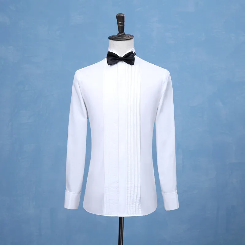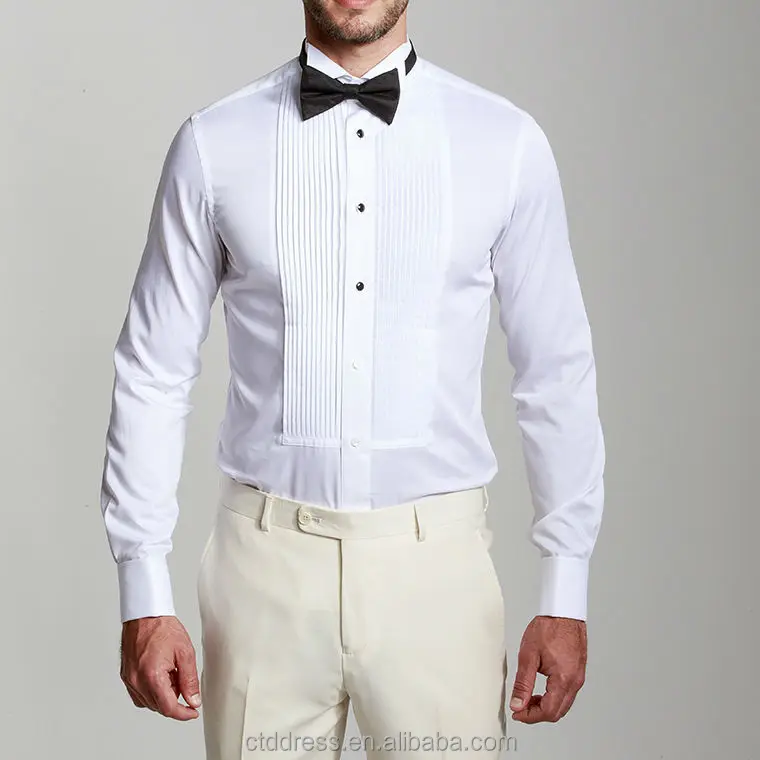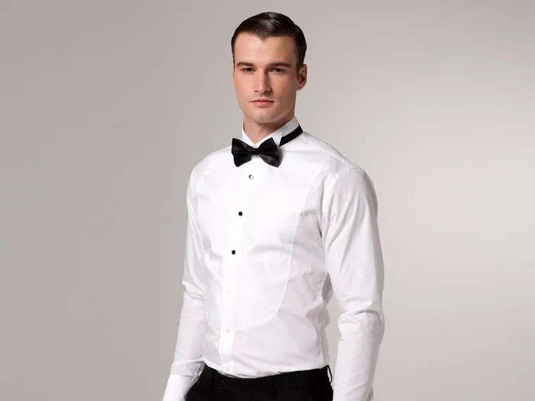 В наше время к классике приписывают и бежевую расцветку, но традиционным считается белая. В сочетании с черным смокингом белоснежная рубашка выглядит бесподобно.