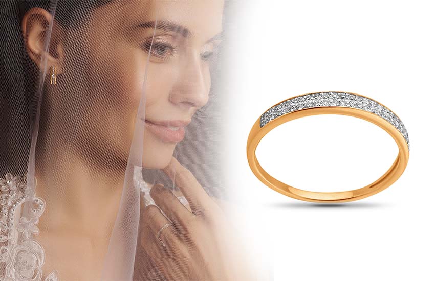 — если свадебное колечко декорировано камнями, массивное или выполнено в ярком дизайне, то сверху надевается тонкий, практически незаметный ободок;