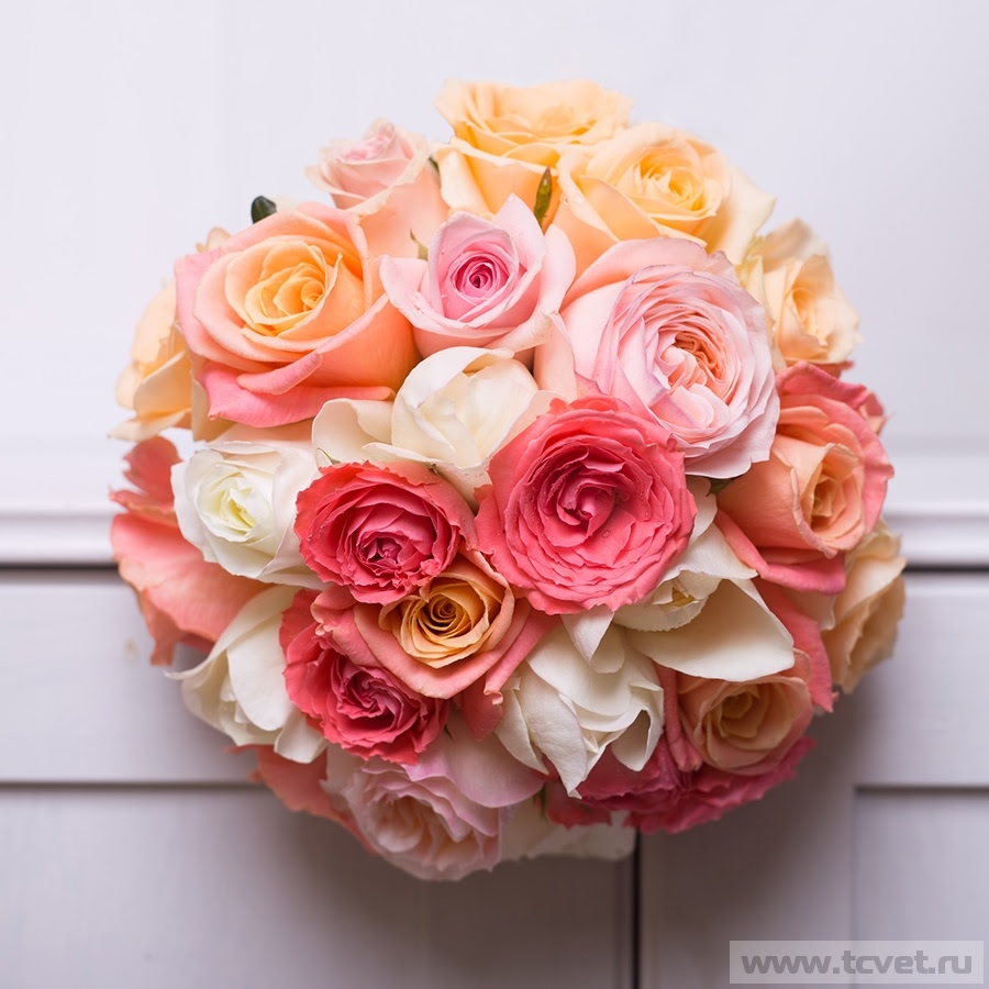 Свадебный букет должен не только прекрасно подходить к наряду, но и подчеркивать торжественность момента. Удачным решением будет композиция в персиковых тонах, которая идеально подойдет к любому цвету платья, подчеркнет нежность и романтичность момента.