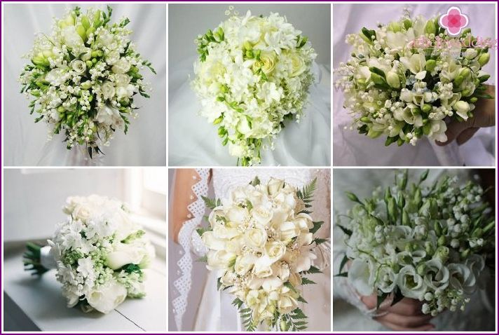Когда жених дарит возлюбленной букет с ландышами и фрезиями, он просит ее довериться ему. Такой знак расценивается как вверение любимой своего сердца. Общему настроению букета фрезия добавляет хрупкость, утонченность, нежность. Интересно смотрится флористическая композиция, включающая фрезии разного цвета, например, белые, красные, оранжевые, что станет яркой изюминкой невесты.