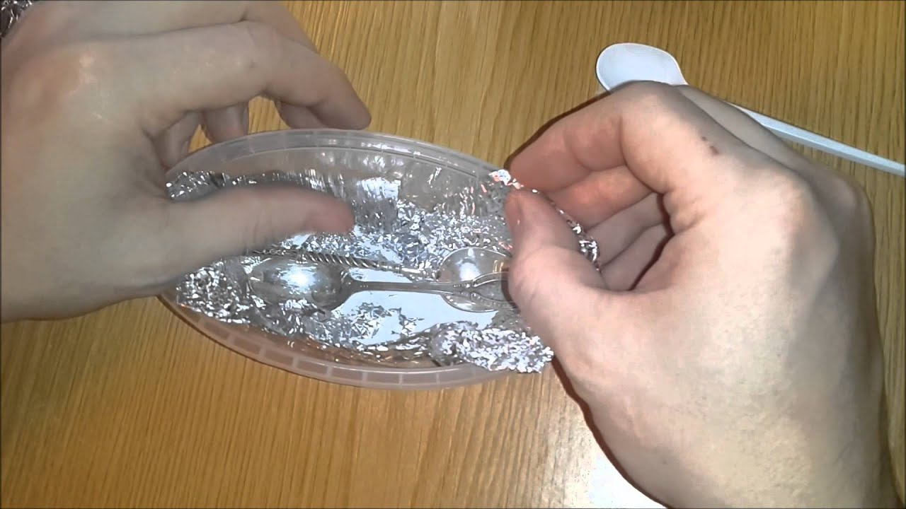 Взять по столовой ложке соли, соды и мыльного средства. На дно эмалевой посуды положить фольгу для выпечки.