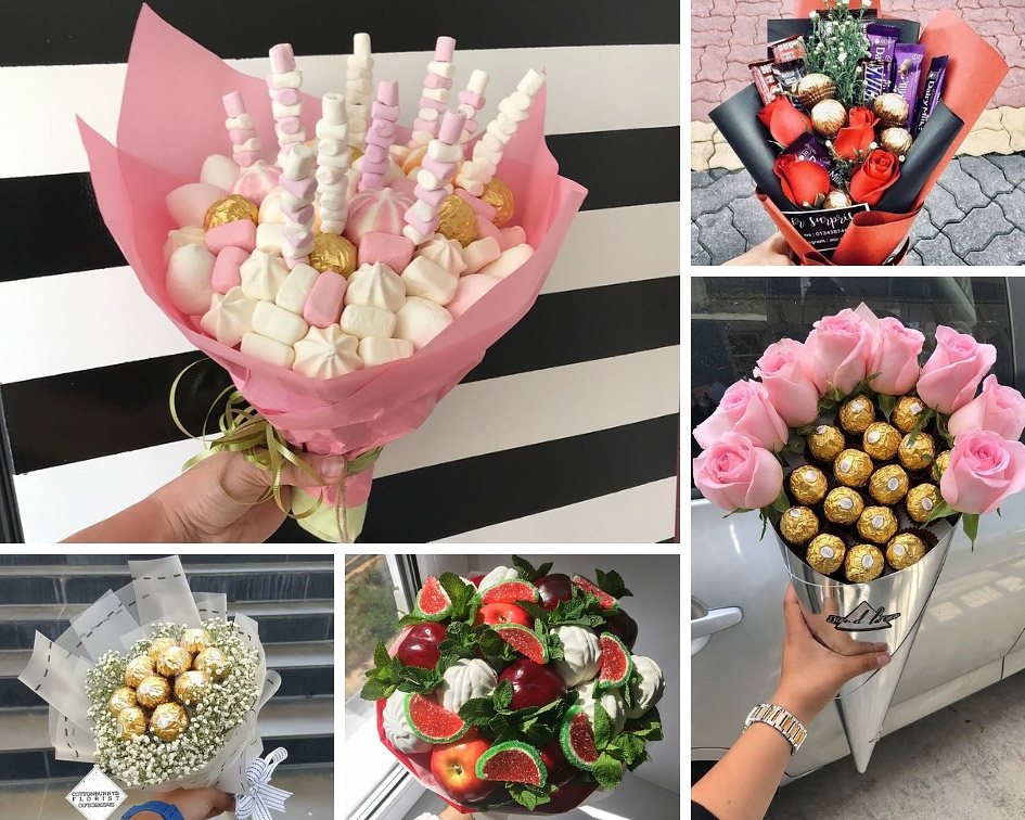 Во-первых, такой презент может хранится гораздо дольше настоящих цветов, а во-вторых — принесет настоящую радость сладкоежкам! Чтобы подарок на свадьбу понравился еще больше, закажите дизайн композиции в цвете и стиле торжества.