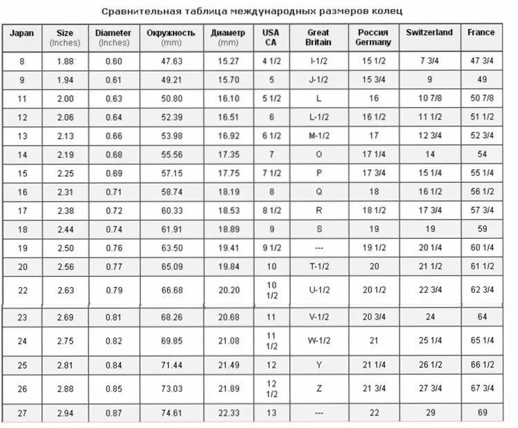 Воспользуйтесь приведенной ниже таблицей преобразования размера кольца , чтобы найти свой размер кольца в разных странах. Нужна помощь? Поговорите с Diamond Expert прямо сейчас, позвонив по телефону 866-737-0754.Диаметр кольца (мм) США/Канада Великобритания Франция Германия Япония Switzerland 904444444444444444444444444444444444444444444444444444444444444444444444444444444444444444.3 F 44 14 4 4 14,4 мм. 3½ G 45¼ 14½ 5½ 6⅓ 14,8 мм 4 H½ 46½ 15 7 6½ 15,2 мм.