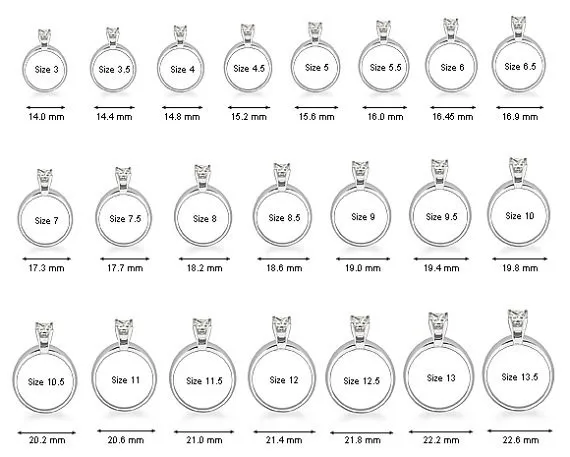 Минимальный размер кольца 1 в этой истеме имеет внутренний диаметр 11.8 миллиметров. С каждым следующим размером диаметр увеличивается на 0.35мм.