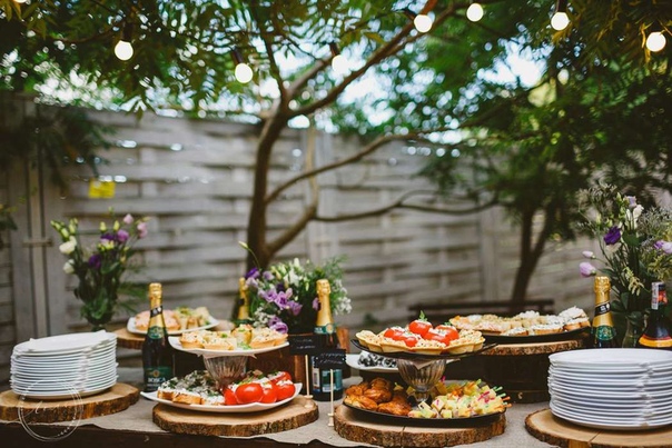 Кроме того, когда свадьба проводится под открытым небом, а гости то и дело находятся в движении, очень удобно, когда у приглашённых всегда есть возможность подойти к общему столу и перекусить.
