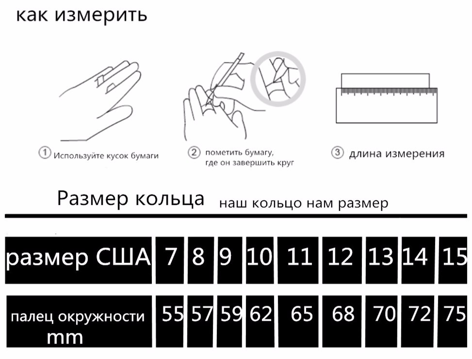 Берем нить, обвиваем ею палец и отмечаем место, в котором конец соприкоснулся с нитью. Полученный отрезок нити для этого измеряем обычной линейкой. Это и будет тот размер, на который мы будем ориентироваться при определении размера кольца. Далее нужно будет сопоставить размер окружности (обхвата) пальца с размером кольца. Сделать это можно по таблице. В среднем кольцо 15 размера подходит к пальцу с обхватом 47 мм, 15,5 — 48,7 мм, 15 — 51,8 мм, 17 — 53,4 мм, 17,5 — 55 мм, 18 — 56,5 мм, 18,5 — 58,1 мм, 19 — 59,7 мм, 19,5 — 61,3 мм, 20 — 62,8 мм, 20,5 — 64,4 мм.