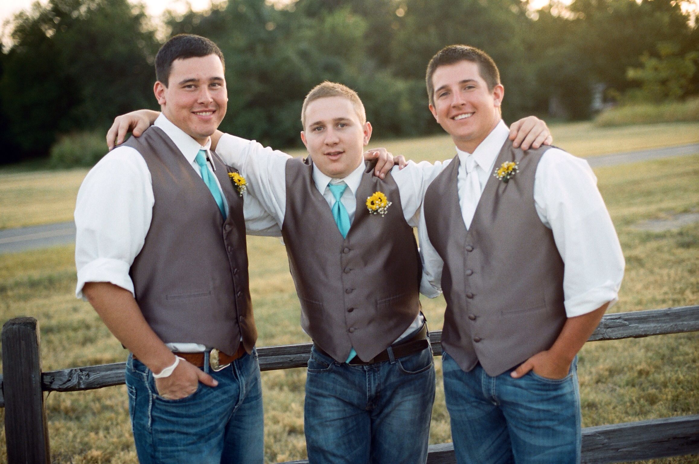 # 2Прозрачные ткани и винтажные жилеты — популярные мужские свадебные наряды в деревенском стиле. Свадьбы в деревенском стиле — это довольно случайное мероприятие, позволяющее сочетать официальную одежду с некоторыми из более непринужденных вещей в вашем гардеробе. Черный пиджак и джинсы, костюм итальянского покроя поверх футболки и черный галстук со шляпой — все это отличные примеры.