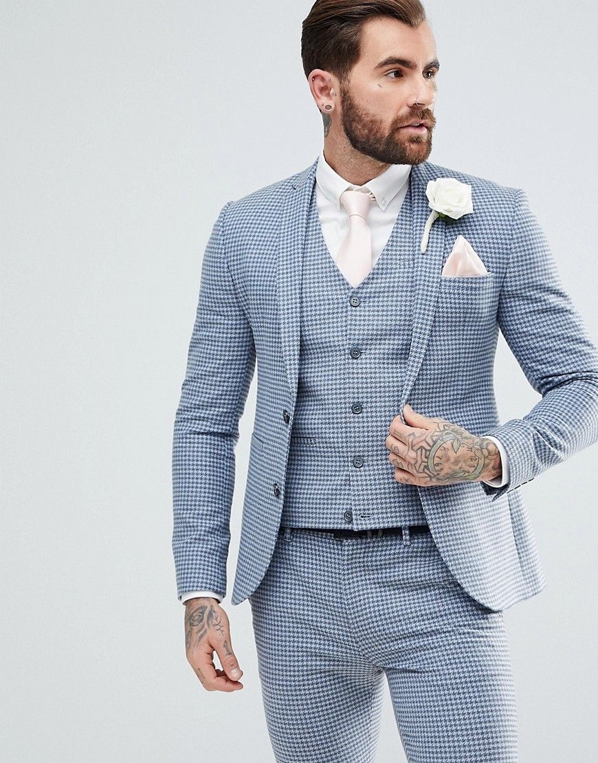 Синий — довольно нейтральный цвет, когда речь идет о нарядах для свадебных гостей. Более глубокие оттенки, такие как темно-синий, хорошо подходят для официальных мероприятий, вечерних мероприятий и зимой. Для более повседневных торжеств, дневных мероприятий и летних свадеб лучше всего подойдут более светлые оттенки. С модным рисунком в клетку и легкой тканью эта забавная двойка — один из лучших свадебных нарядов для парней летом.