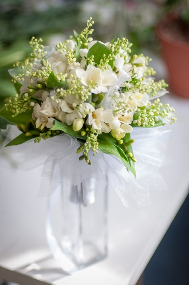 Этот красивый букет создан на подставке для букетов. Он представляет собой простую смесь белых роз и ландыша.