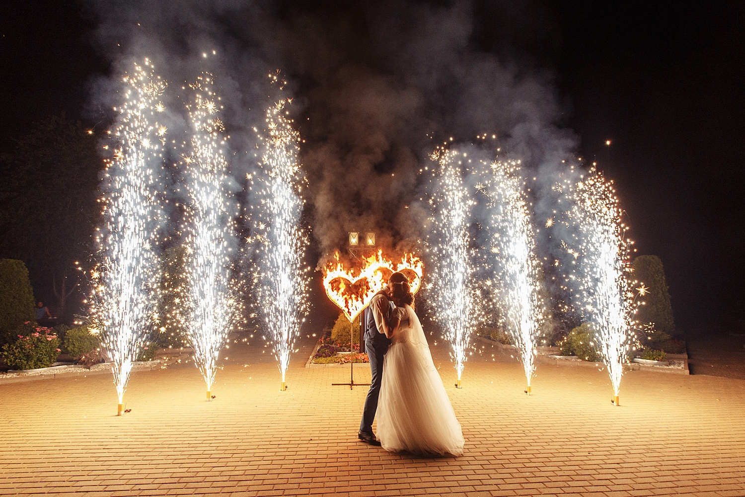 Такую композицию можно усилить профессиональной пиротехникой. Когда сердца будут гореть, на заднем плане вспыхнут 2/4/6/8 концертных пиротехнических фонтанов (фото 2 и 3). Фонтаны – это 100% гарантия создания ощущения торжественности и фееричности. Море искр, неповторимый звук пиротехники… и выброс гормона счастья в кровь гарантированы 🙂