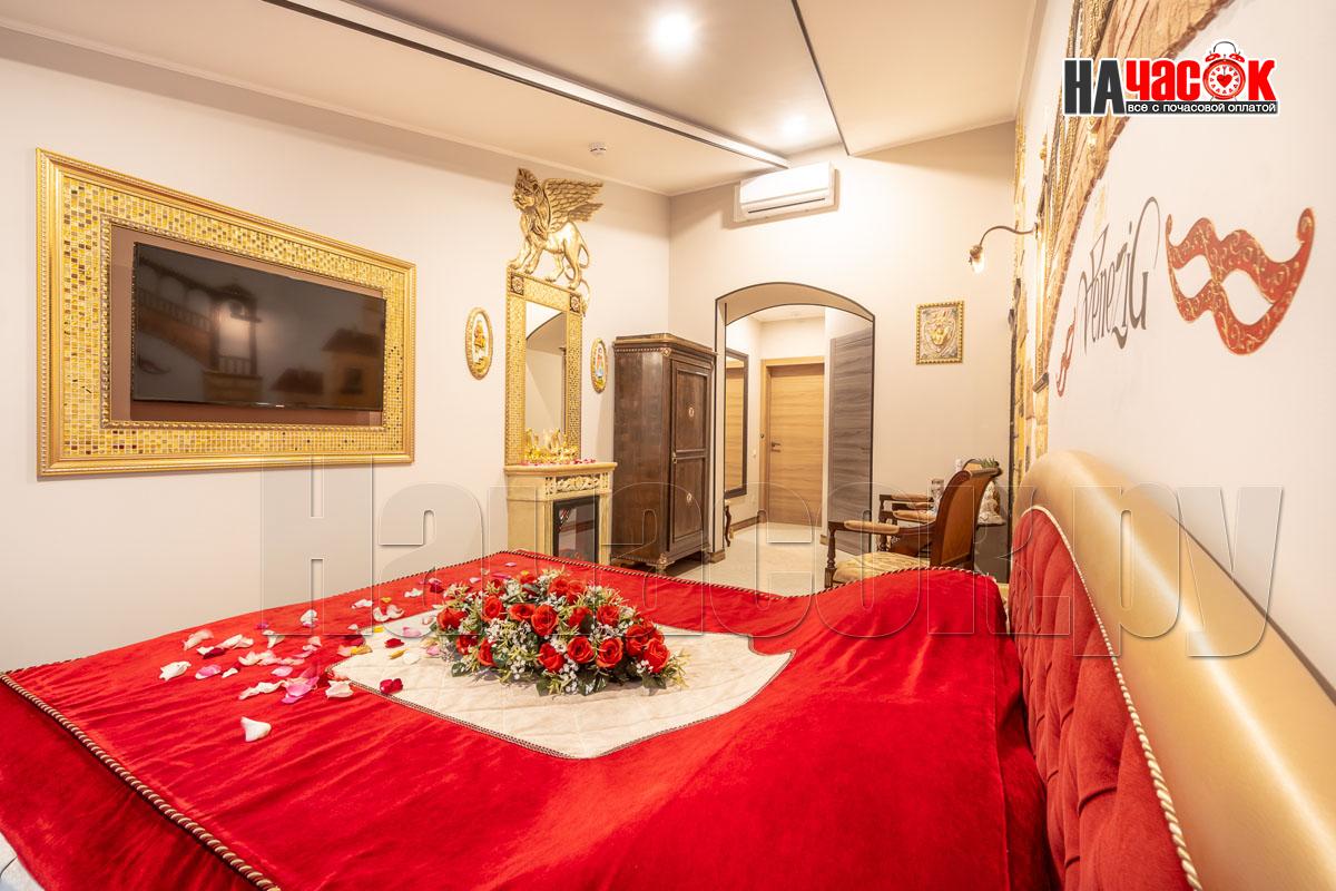 В номере для молодоженов предусмотрено все, что может понадобиться: мини-бар, кондиционер, телевизор, чайник, современный санузел. В стоимость входят халаты, полотенца и тапочки, чай и кофе. Предусмотрен поздний выезд из гостиницы.