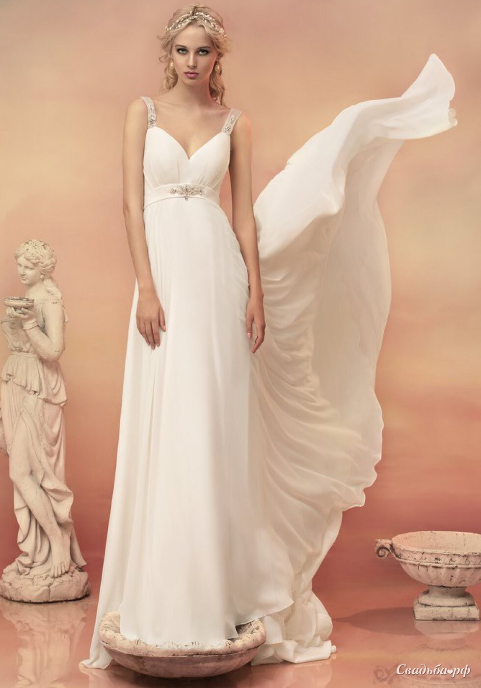 Буквально каждый дизайнер, который творит одеяние для столь важных праздников жизни, прибегает к этому чудесному фасону. Недаром о красоте Афродиты сложены миллионы мифов, ее образ рисовали великие художники, и каждый бог Олимпа грезил быть с такой прекрасной женщиной. Платье в греческом стиле просто бриллиант, который каждая невеста может обточить сама для себя. Главное для юных богинь Олимпа помнить, что залог красоты этого платья – изящная дорогая ткань, которая как морская волна покроет ваше тело и придаст ему грацию.