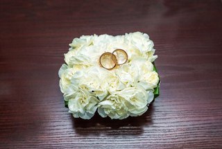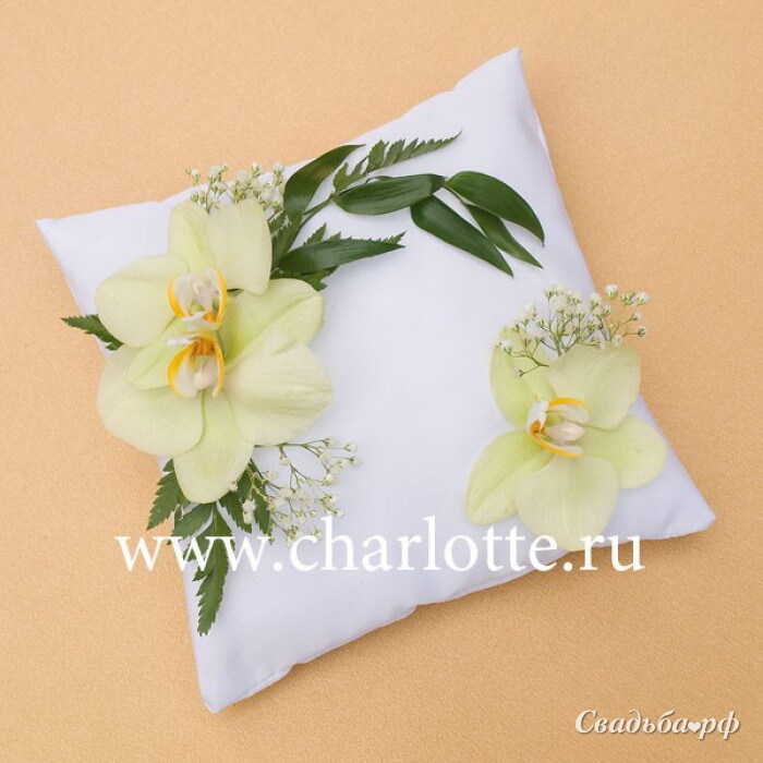 - Подушечка из живых цветов. Этот вариант доступен и прекрасно будет смотреться для весенней/летней свадьбы. Для изготовления таких предметов используют ромашки, орхидеи, розы.