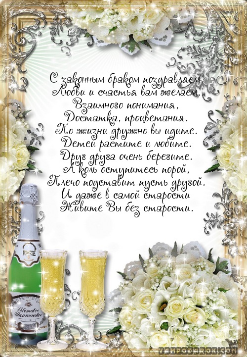 Поздравляю Вас с Вашей свадьбой! Желаю, чтобы в жизни все ладилось. Пусть Ваша семейная жизнь работает, как часы, не зная сбоев! Пусть Любовь, Дипломатичность, Чувство Такта и Уважение друг к другу сглаживают все острые углы в Ваших отношениях! Желаю, чтобы денег у Вас всегда было достаточно! А дети больше радовали!
