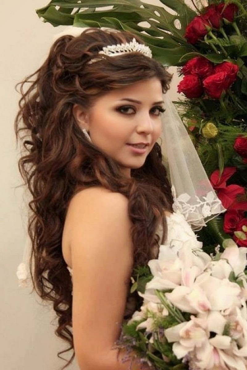 Весьма праздничный образ поможет создать прическа с распущенными волосами для брюнеток. Пряди делятся на не четкий боковой пробор и укладываются в роскошные мелкие кудри. Прическу необходимо зафиксировать лаком.