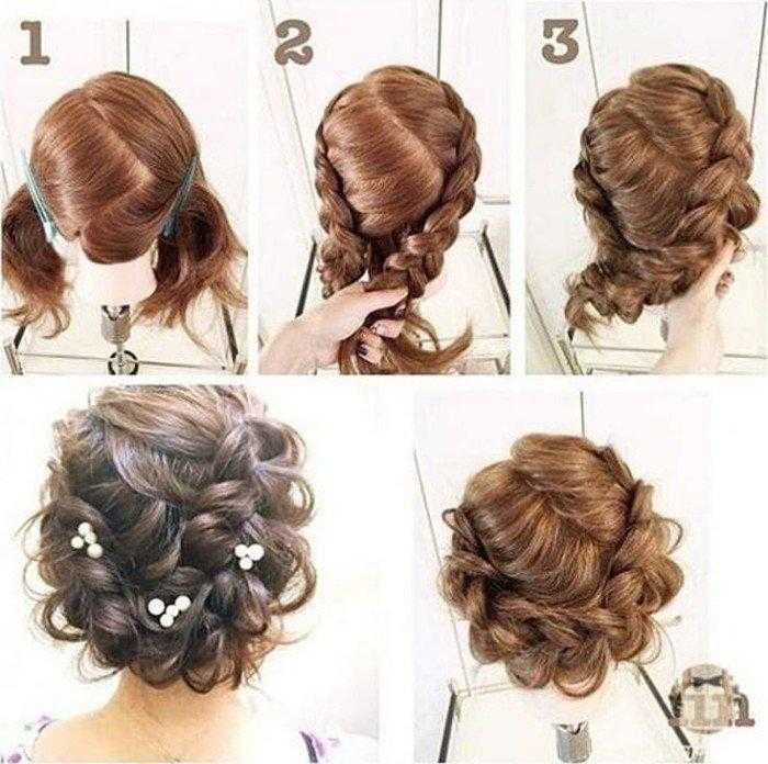 Эта прическа, сделанная на средних волосах, напоминает и пучок, и ракушку, только собранные волосы красиво перекручиваются, образуя интересные завитки.