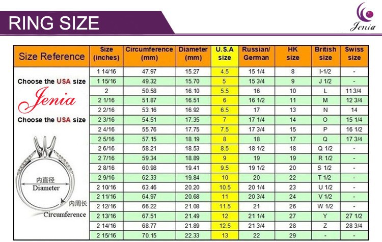 Размер кольца может быть указан в виде длины диаметра или длины внутренней окружности кольца в миллиметрах или дюймах. Кроме того, используются различные шкалы номеров размеров, которые обозначаются числами или буквами.