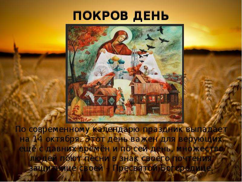 Покров всегда горячо любили в народе, это был день особый — на Покров не работали, на Покров играли свадьбы, а по тому, какая погода случалась на Покров, судили, какая впереди зима. Наши предки говорили: «Снег на Покров — зима выдастся снежная, но если он не покроет на Покров землю — и зима будет бесснежной».