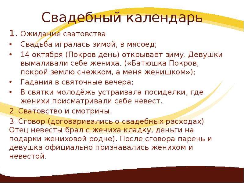 Многие задаются вопросом: «Можно ли жениться после Покрова?» То есть не ограничивается ли счастливый период всего одним днем. Еще раз повторим: свадьбу в старину не обязательно играли на сам праздник – могли сдвинуть дату на пару дней.