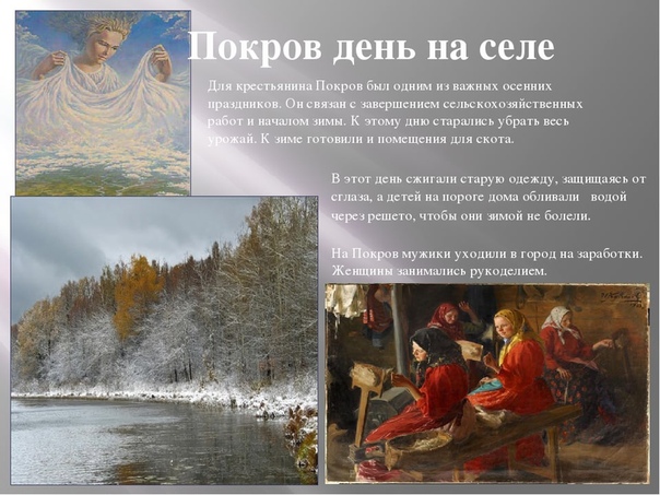 В Древней Руси на Покров завершались сельскохозяйственные работы, и зачастую выпадал первый снег. И потому в народе говорили «Покров кроет землю то листом, то снегом».