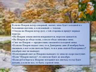 — Если к Покрову листьев на деревьях не останется, то зима будет легкой, снежной. Если останутся листья – придут сильные морозы;