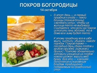 Торжественное событие не предполагает работу по дому. Уборку и стирку лучше перенести на другой день и посвятить время, к примеру, приготовлению различных блюд. Стол с богатым ассортиментом съестного будет как нельзя кстати — на Покров день принято встречать гостей. Причем никаких ограничений в меню нет — никакой пост не приходится на 14 октября.