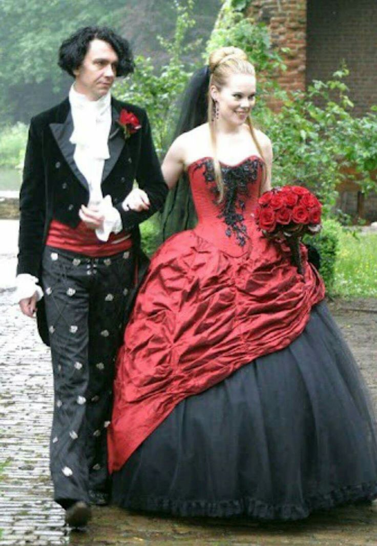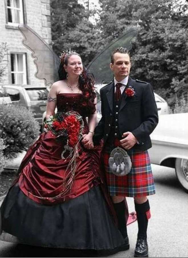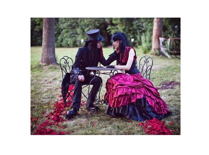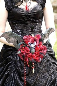 Для невесты подойдет корсетное платье, отделанное кружевом. Оно может быть как однотонным, так и двуцветным. Как мы уже говорили, готы любят красный цвет, и не зря. Сочетание черного и красного, или малинового, смотрится очень эффектно. Платье должно быть немного ассиметричным. Отлично будет смотреться платье со шлейфом, скромное сзади и дерзкое впереди, открывающее взору коленки невесты. Ну и конечно не забудем про органзу, которая хорошо сочетается с кружевом и придаст платью торжественность и воздушность. В прохладное время года не помешает обзавестись кружевной накидкой с расклешенными рукавами.