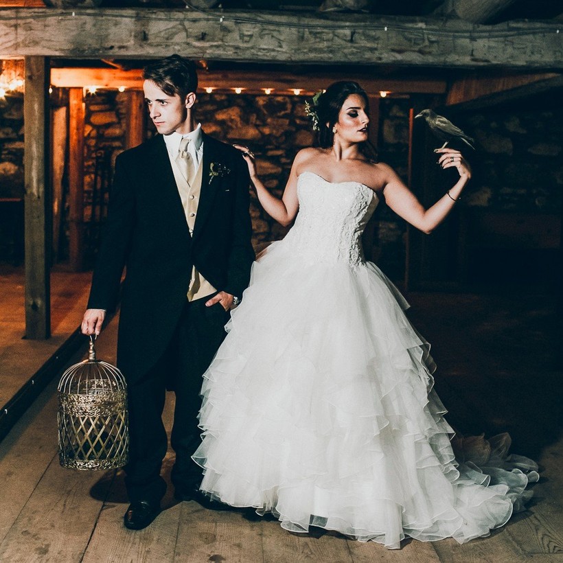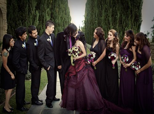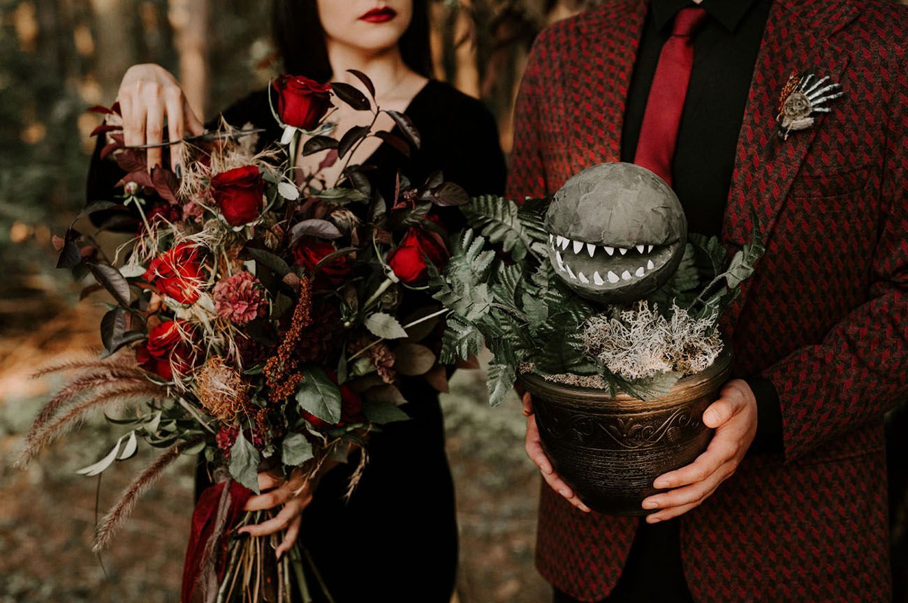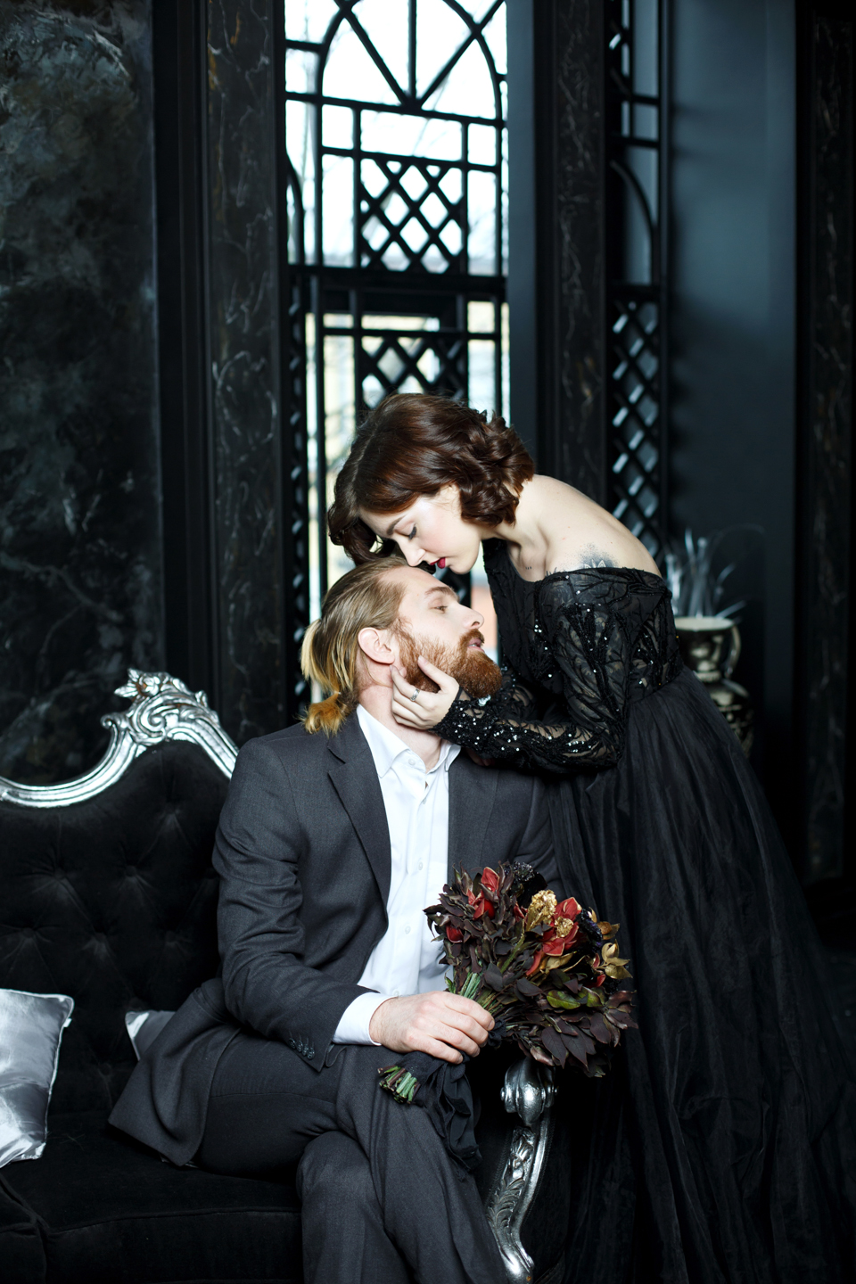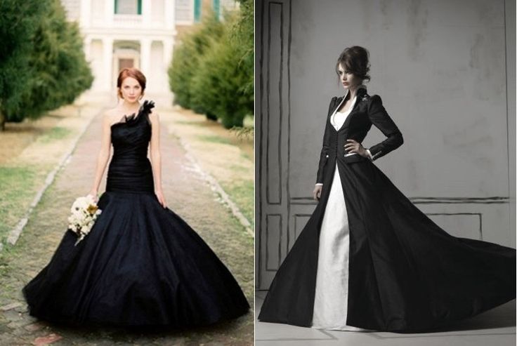 А невеста… будь смелой и надень пышное черное платье. Если вы хотите немного приподнять образ, вы всегда можете дополнить его цветами и вуалью.