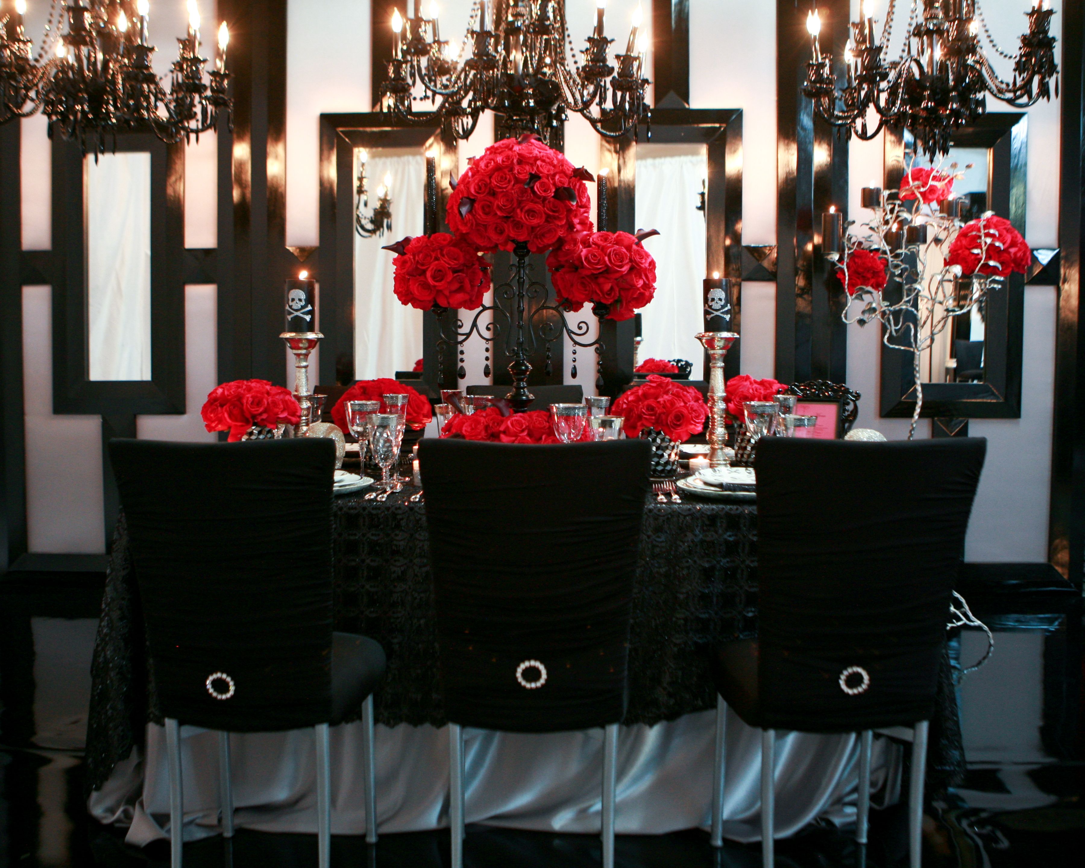 Канделябры, «усыпанные» цветами, просто созданы для этого готического образа. Черные свечи добавляют дополнительное измерение. Убедитесь, что ваши гости могут видеть эти цветы, всегда размещая композиции в густонаселенных местах.