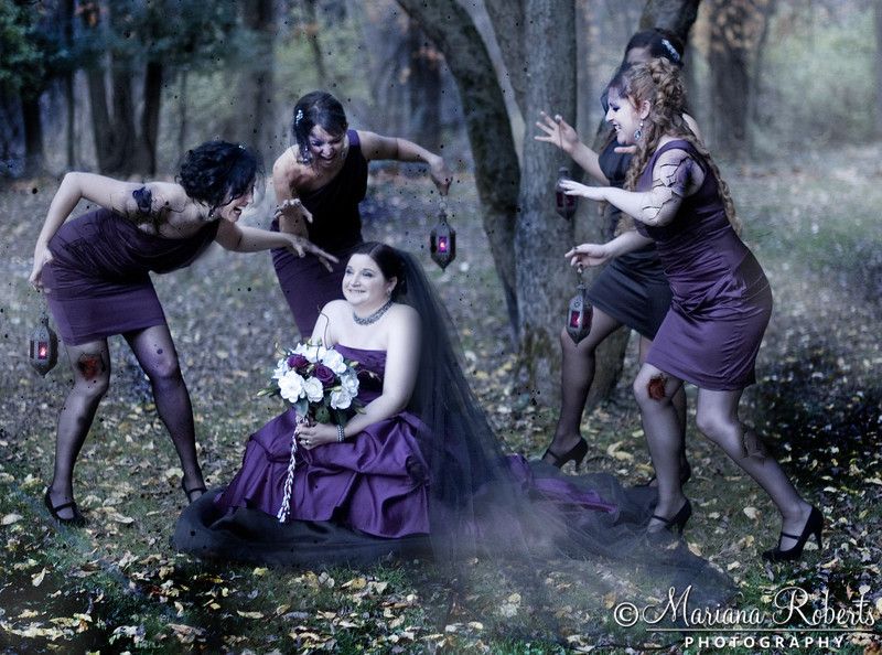 Свадебное платье должно оставаться им, так что пропусти костюм Невесты Франкенштейна в пользу чего-то драматичного, но все же близкого свадебному дню. Винтажные кружева и длинные рукава возвращаются в моду и прекрасно гармонируют с темой Хэллоуина. Если же тебе близки платья с тёмными акцентами, ты просто обязана прочесть нашу статью о чёрных свадебных платьях! Когда дело доходит до платьев подружек невесты, выбирай глубокие тона – или все чёрное! – и у вас будут друзья, выглядящие странно, но шикарно.