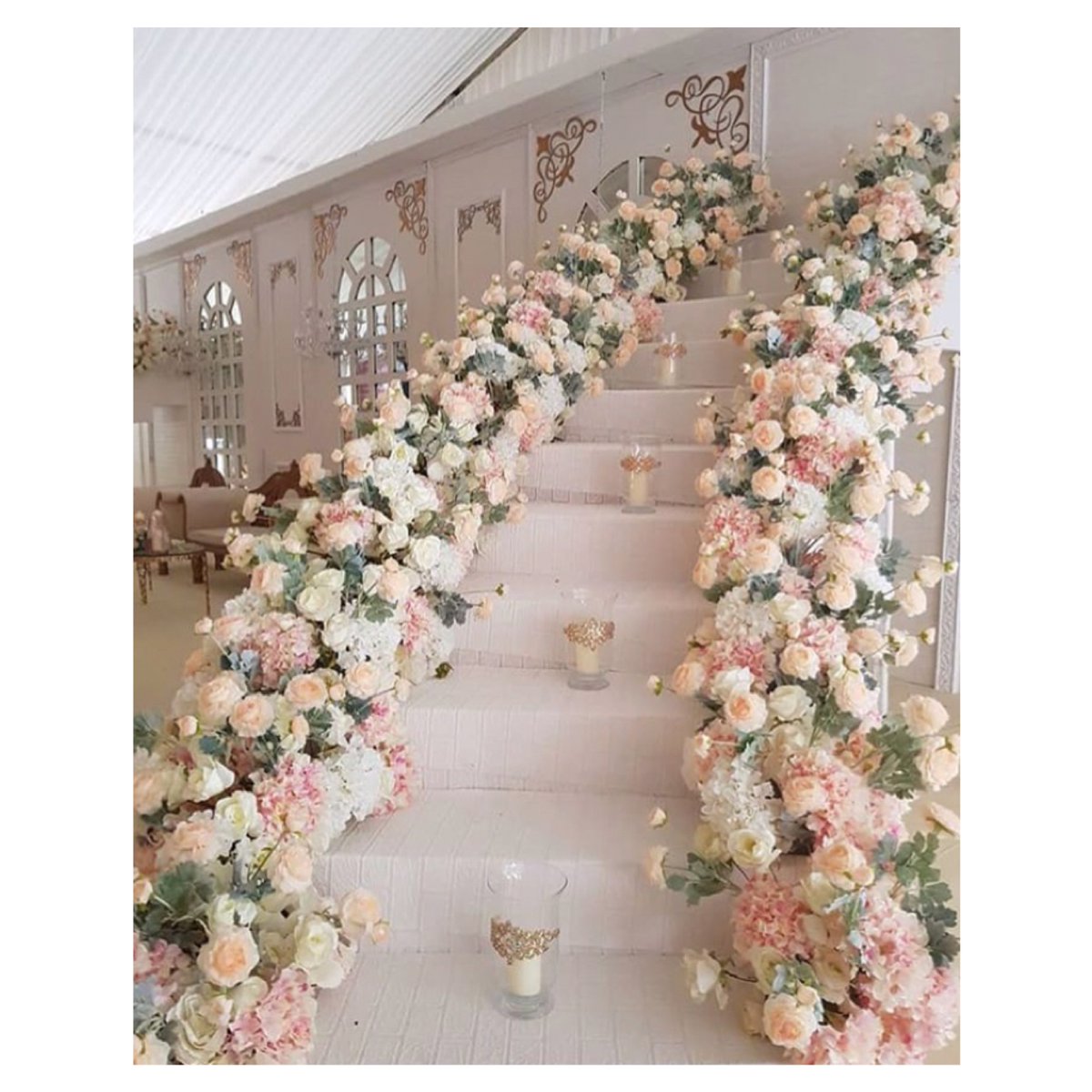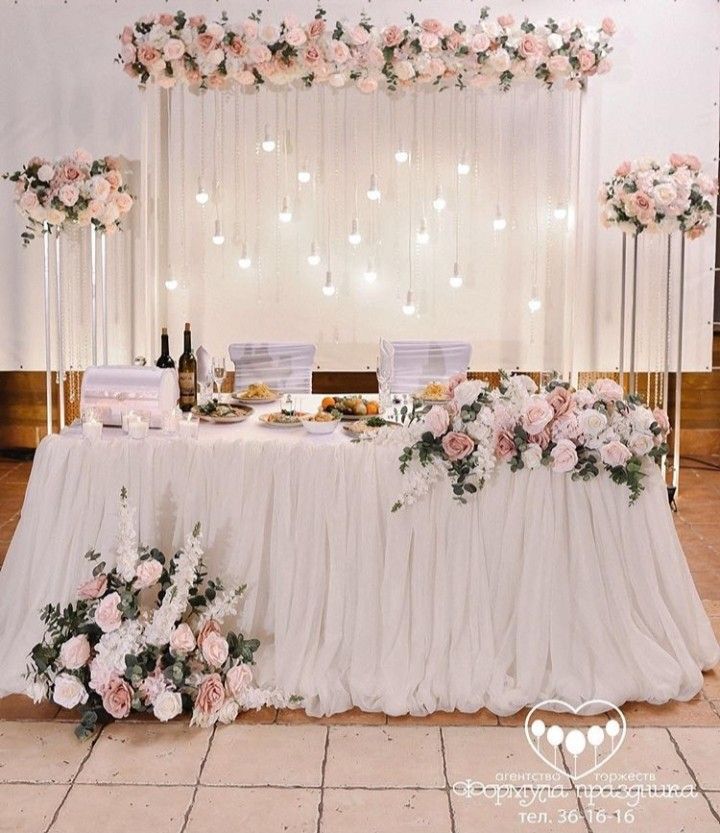 Потрясающий интерьер с множеством розовых и белых цветов, украшающих потолки и сцену