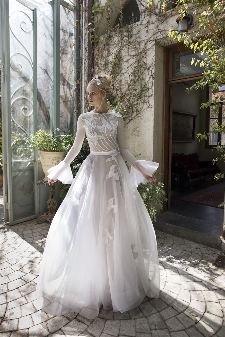 Интересно смотрится свадебное платье бохо стиля с открытой спиной. Эффект отсутствия ткани создает прозрачная сетка, как в модели Gabbiano Moira, в которой присутствие невесомого материала на хрупкой спине невесты подчеркивает только бесконечный ряд миниатюрных пуговичек.