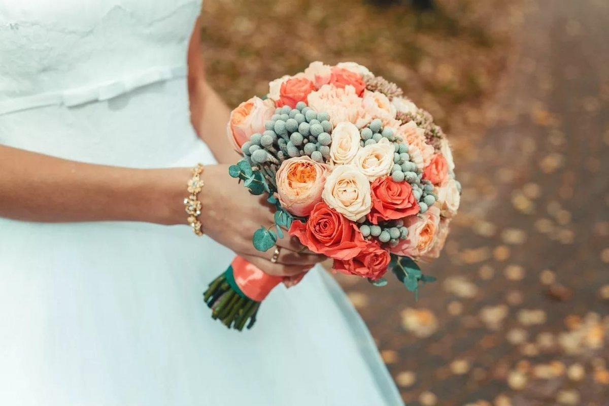 Для коралловой свадьбы невесты часто приобретают однотонные букеты. Разнообразить цветовую гамму можно с помощью белых, голубых или кремовых оттенков. Красиво в букете смотрятся вкрапления яркой зелени.
