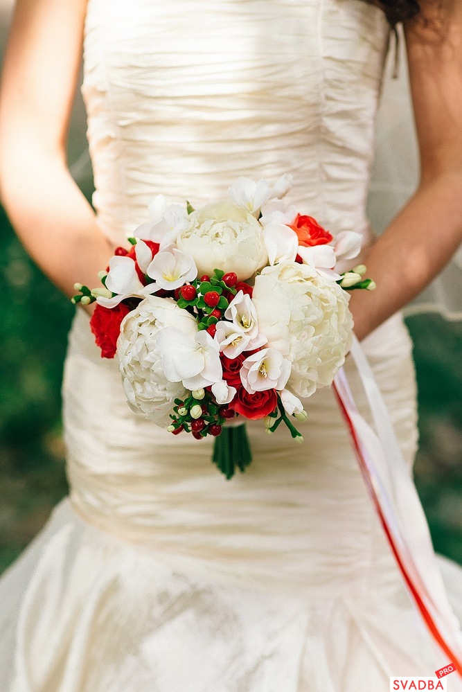 ЗаключениеКрасный букет невесты смотрится ярко и выигрышно на фоне белого классического платья. Букеты красного цвета могут создаваться для свадеб, проводимых в любое время года.