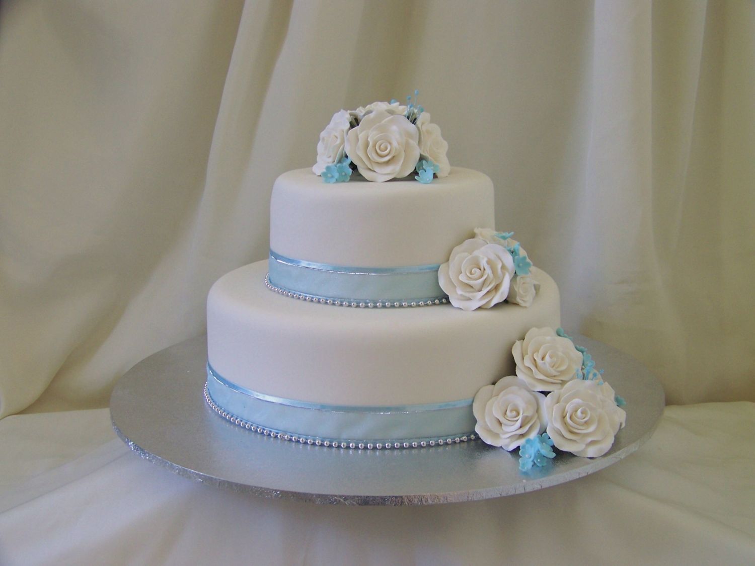 Они могут быть белого либо голубого цвета, в зависимости от основного тона лакомства. К примеру, если вы выбрали для покрытия изделия голубоватую мастику, тогда розы или рюши должны быть нежного белого тона. Если лакомство имеет не один ярус, тогда в качестве декора стоит использовать ленты белого цвета, а основной тон будет голубым.