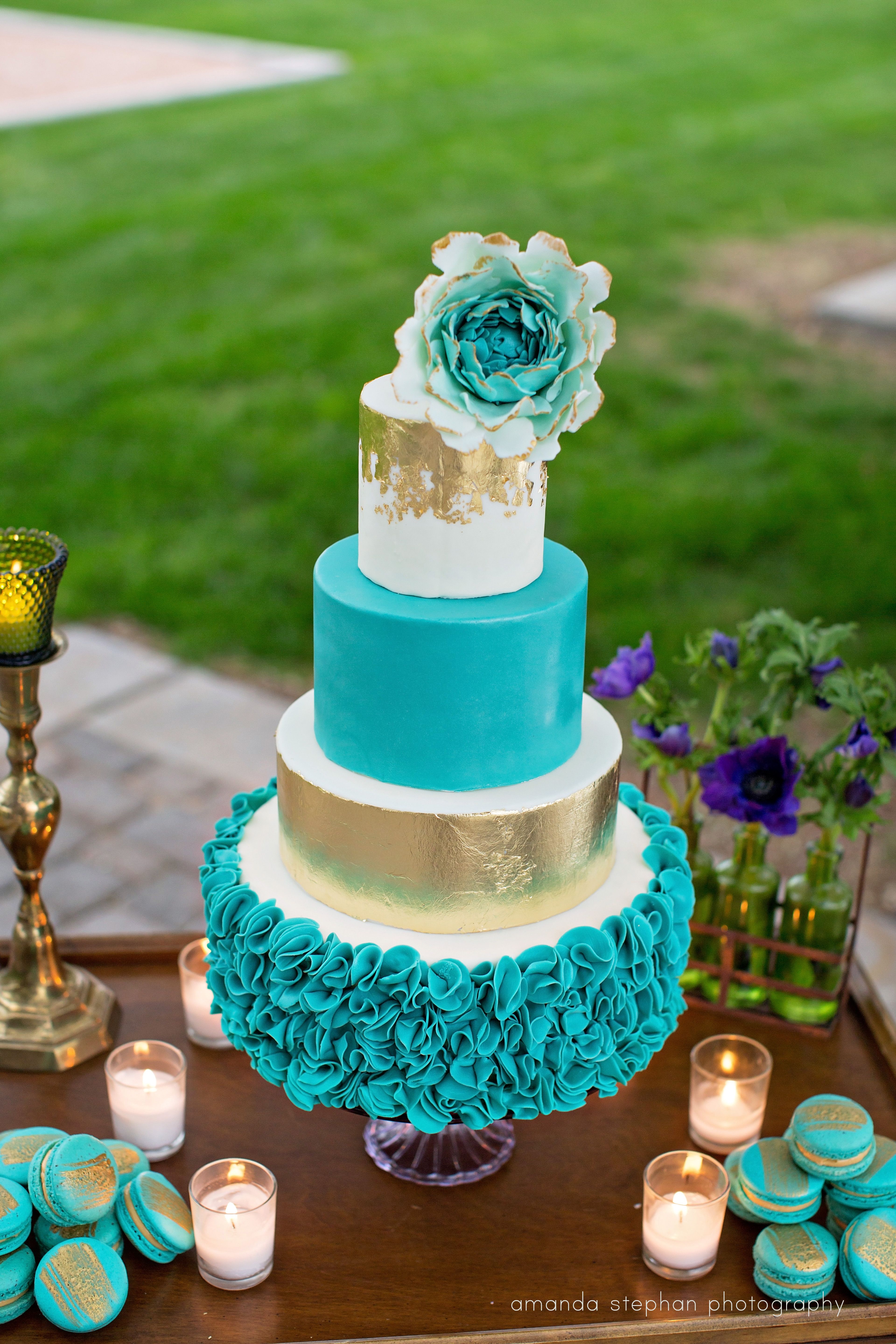 свадебный торт акварель тиффани синий, украшенный золотой фольгой и большим белым сахарным налетом сверху