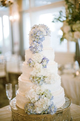 белый свадебный торт, украшенный нейтральным и синим тиффани сахарные цветы выглядят элегантно и шикарно