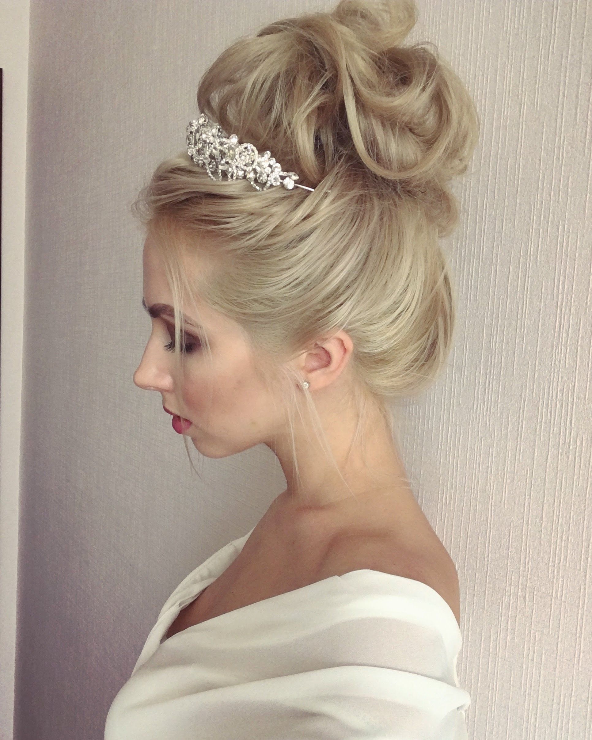 - Диадема или тиара добавляет торжественности. Прическа с таким декором по-королевски величественна, однако она не терпит соседства с другой бижутерией. Поэтому от колье или ожерелья придется отказаться, а серьги выбрать небольшие.