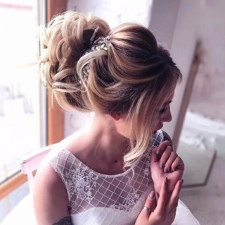 А также классическим вариантом свадебной прически считается пышный пучок. Его можно укладывать на макушке, усиливая объем начесом, либо на затылке. Оформление предполагается различное, вот лишь некоторые способы: