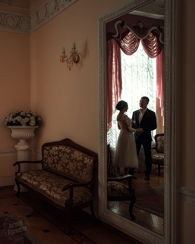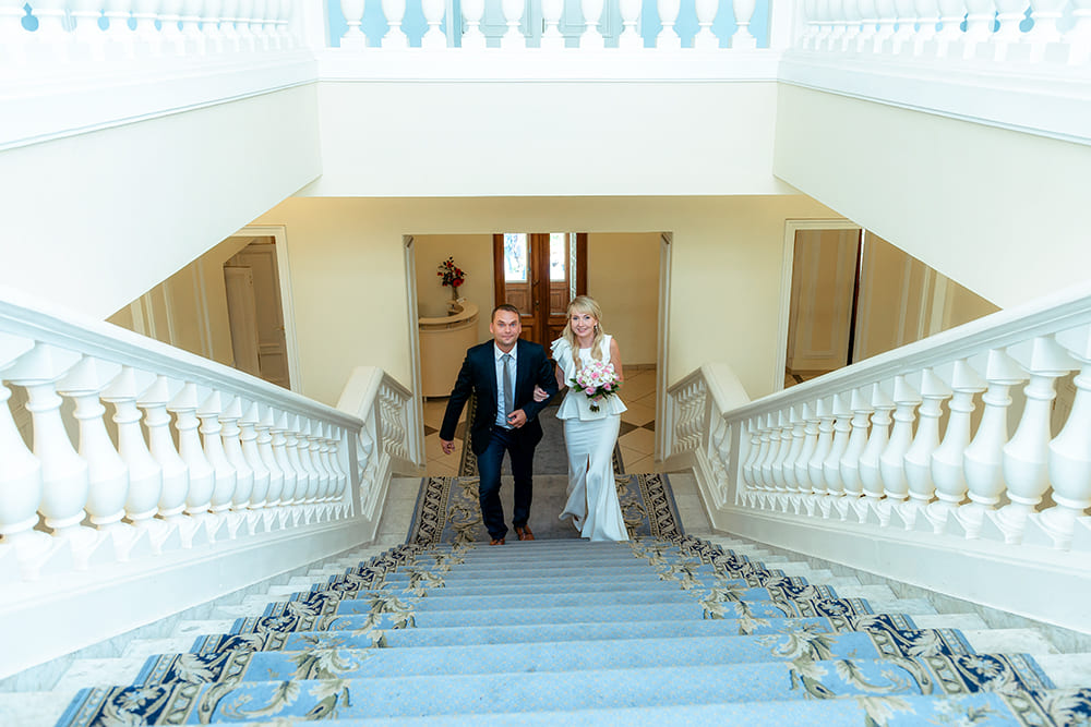 Лестница ведет наверх – в Зал торжеств и комнаты жениха и невесты. Благородные пастельные тона, стилизованная под старину мебель, пианино и изящные драпировки на окнах – таков дизайн этих комнат, где жених и невеста со свидетелями ожидают начала торжества и завершают последние приготовления к нему.