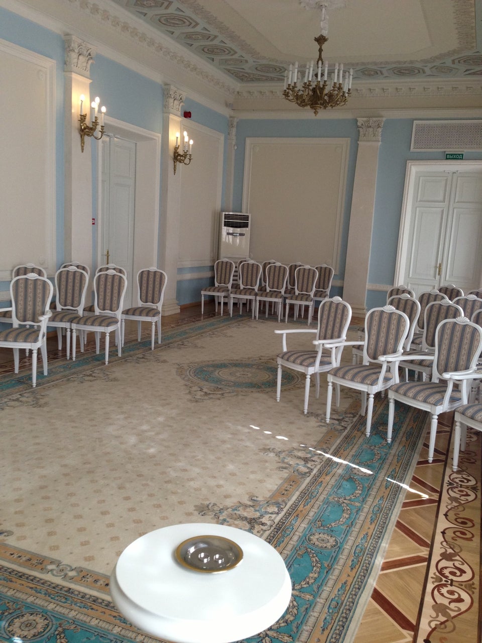 Зал торжеств, где проводятся церемонии, после ремонта стал еще краше: на полу – наборной паркет, подобранный в тон стен ковер, удобные стулья для гостей. Высокие потолки с потрясающе красивой лепниной, роскошные люстры, создающие очень хорошее освещение, большие окна с искусной драпировкой усиливают ощущение торжества и праздника, на который приглашено столько гостей.